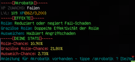 Sobald du von einem höheren Ort hinunterfällst, erhöhen sich deine XP für den Akrobatikskill, diese kannst du mit /akrobatik einsehen. Infos Akrobatik