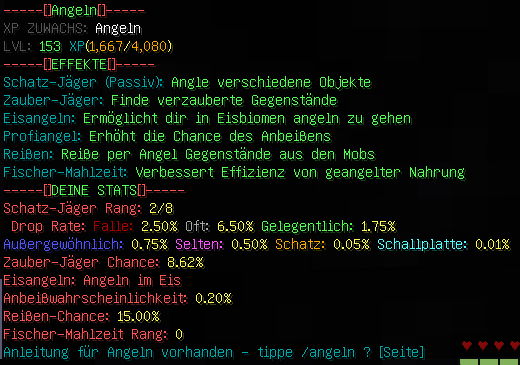Der Angelskill erhöht sich durch angeln. (wow ;)) Alle Informationen zu dem Skill siehst du bei /angeln. Infos Angeln.