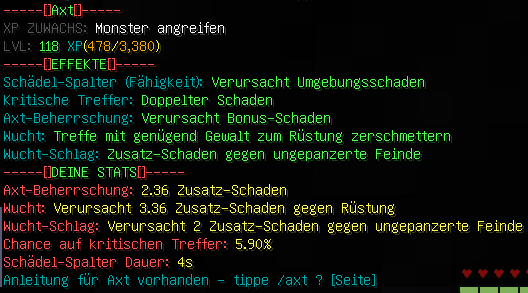 Wenn du deine Axt als Waffe gegen Monster verwendest, kannst du sie auch Skillen und damit besondere Eigenschaften hervorrufen. Was alles möglich ist siehst du bei /axt. Infos Axt