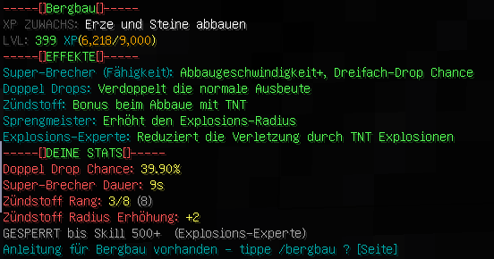 Bergbau farmst du durch den Abbau von Steinen und Erzen mit einer Spitzhacke. Mit /bergbau kannst du kannst du die genauen Informationen zu deinem Bergbauskill einsehen. Du kannst dort ebenfalls die speziellen Fähigkeiten mit steigendem Skilllevel sehen, diese sind auf dem Screen zu sehen: Infos Bergbau