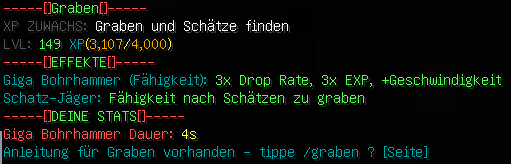 Wenn du mit einer Schaufel Sand, Gras, Erde, Kies, Ton etc. abbaust, wird sich dein Grabenskill erhöhen. Deinen Fortschritt siehst du bei /graben. Infos Graben