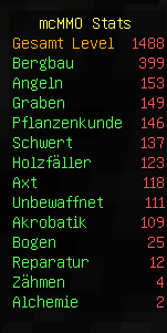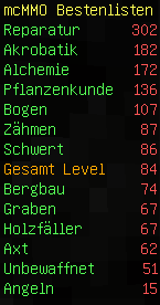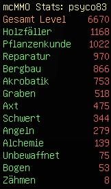Mit /mcstats werden am rechten Bildschirmrand alle Skills (außer Schmelzen) zum aktuellen Zeitpunkt aufgelistet, mit /mcrank siehst du dein aktuelles Ranking in den jeweiligen Skills und mit /mctop <Skill> <Seite> kannst du die Toplisten einsehen, wahlweise eines speziellen Skills oder einer anderen Seite als nur die Seite 1 (Platz 1-10). Wenn du den Skill weglässt, wird das höchste Powerlevel angezeigt – dieses berechnet sich aus der Summe aller Skills.