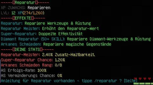 Dein Reparatur-Skill erhöht sich, wenn du in einem mcMMO-Amboss deine Waffen oder Rüstungen reparierst (Eisenblock) oder wenn deine Rüstung ausreichend beschädigt wird. Du findest alle Informationen bei /reparatur. Infos Reparatur