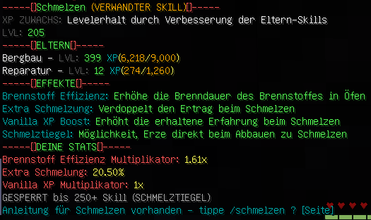 Durch höheren Skill ist die Brenndauer deiner Brennstoffe in Öfen höher, du hast die Chance auf doppelten Ertrag beim Schmelzen und die Möglichkeit, dass direkt beim Abbau ein Erz geschmolzen wird. Außerdem bekommst du durch Schmelzen mehr Erfahrung - deinen Fortschritt kannst du bei /schmelzen überwachen. Der Schmelzen-Skill bezieht sich nicht nur auf Erze, sondern auch auf z.B. Steine.