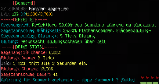 Ein Gegenangriff wirft den zugefügten Schaden des Gegners mit einer gewissen Chance und Stärke auf diesen zurück (skillabhängig). Wenn du mit Rechtsklick den Sägezahnschlag aktivierst, dann ist es möglich, dass du einen Gegner zum Bluten bringst und er somit über einen Zeitraum Extraschaden bekommt.