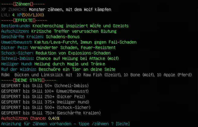 Der Zähmen-Skill erhöht sich beim Zähmen von Tieren und wenn du Tiere beschwörst. Alle Informationen hierzu findest du bei /zähmen. Infos Zähmen